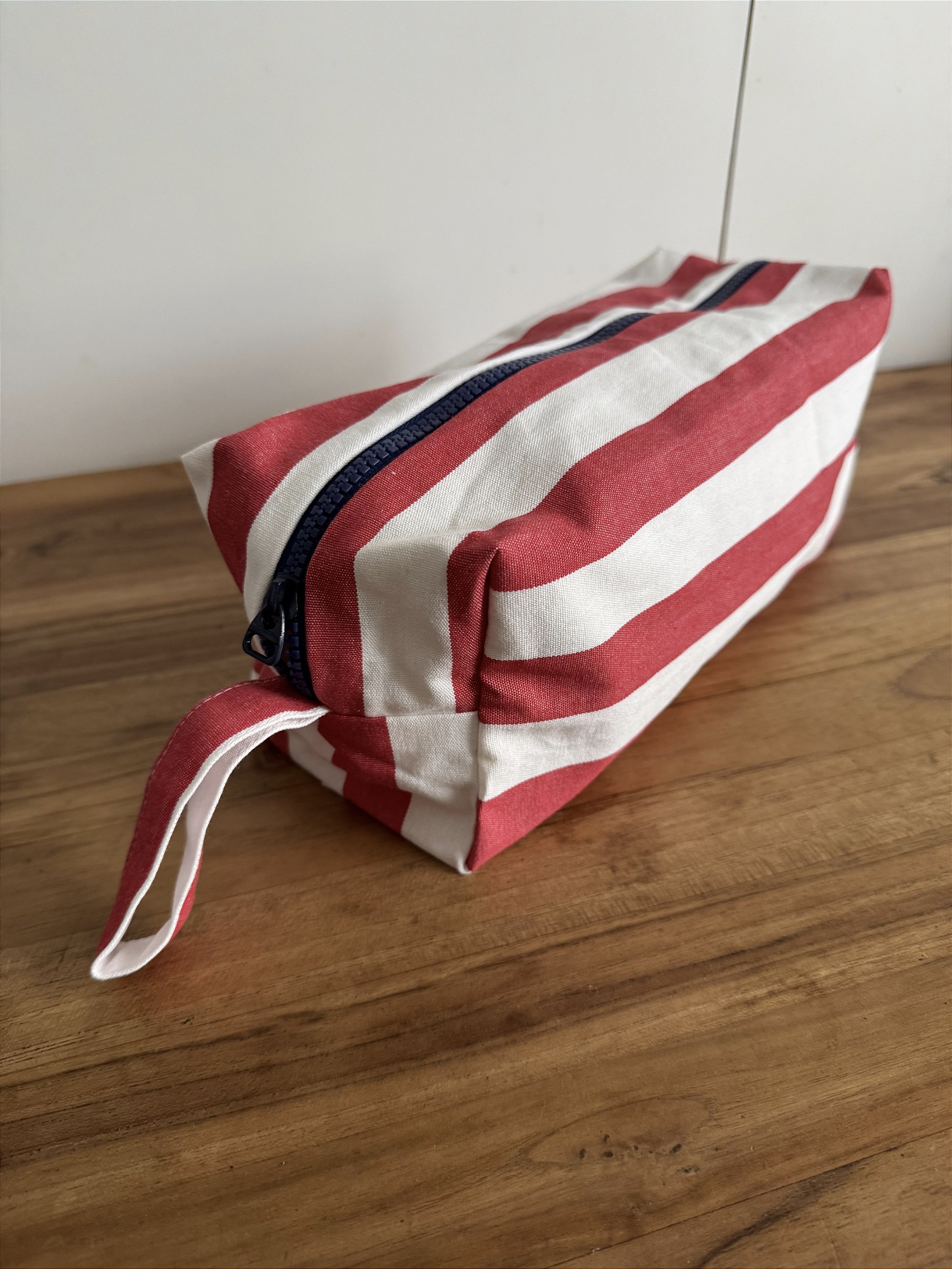 Necessaire feita em lona leve de algodão, com forro e fecho colorido.