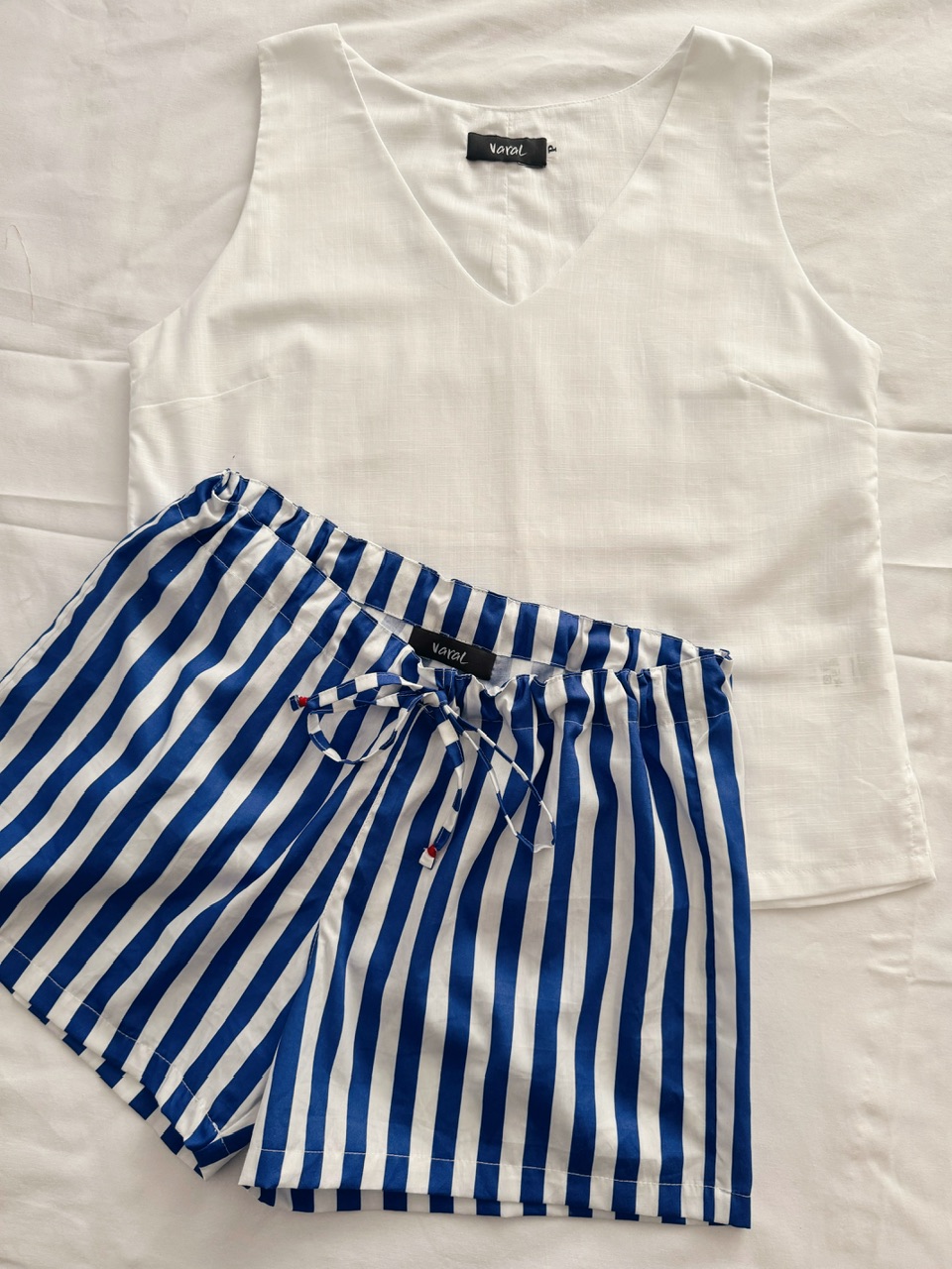 Short tricoline 100% algodão listras azul e branco. Com elástico na cintura e cadarço para ajuste.