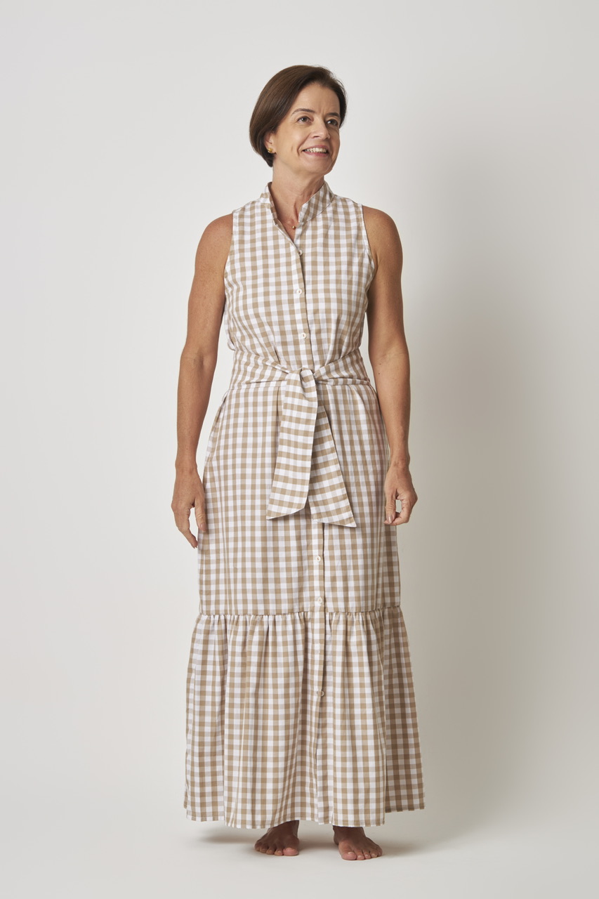 Vestido longo, estampa vichy bege, em tricoline 100% algodão. Fechamento frontal com 11 botões de madreperola.
